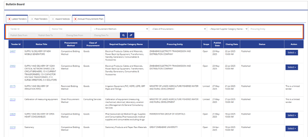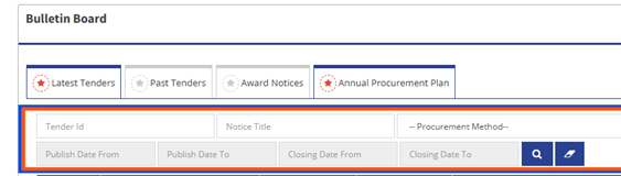 You will arrive at the latest tenders available in the Egp portal. To easily and quickly find the tender you are interested in, you can make use of the filters made available to you at the top of the table highlighted below.