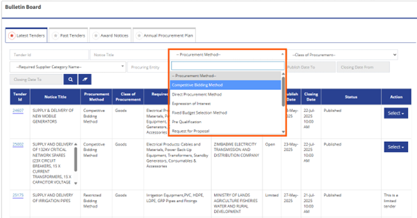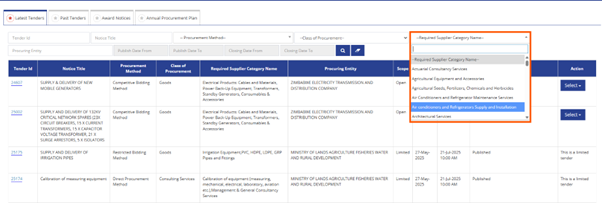 This filter displays tenders according to the procurement method they are listed as, for example if you are interested only in Expression of Interest tenders, clicking this will only show the type of tenders you want to apply to saving your hours of scrapping though each and every table listing which can be very frustrating.