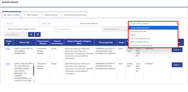 You can also use the Class of Procurement when looking to narrow down your search. This displays the type of tenders you are interested in, ranging from consulting services to works. This makes sure you are not wasting time aimlessly searching for tenders in general classes.